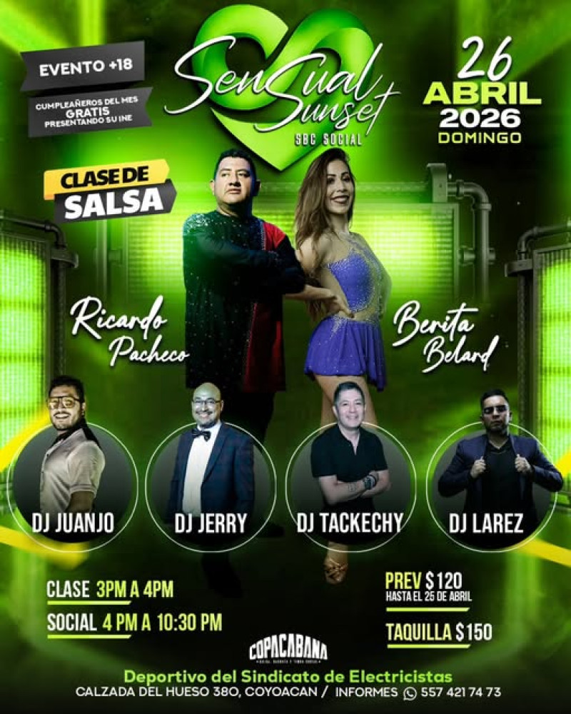 Sensual Sunset es un evento de baile con música de salsa, bachata y cumbia, con la participación de 4 DJs (Dj Juanjo, Dj Tackechy, Dj Jerry y DJ Larez). Incluye clase de salsa impartida por Ricardo Pacheco y Berita Belard. Habrá fotografía y video profesional, estacionamiento, alimentos y bebidas disponibles, y descorche libre bajo condiciones. Evento para mayores de 18 años.